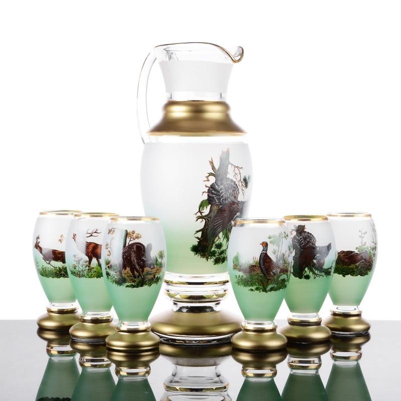 Набір для води Немо складається з одного графина і шести склянок. Він виготовлений з якісного богемського скла, яке відрізняється вишуканістю і тонкістю. Графин прикрашений зображенням фазана, а склянки – зображеннями різних тварин в лісі: оленя, зайця, дикого кабана. Набір можна використовувати для води, соку або компоту. Він обов'язково доповнить і прикрасить кожен обідній стіл. Такий набір сподобається всім шанувальникам полювання. Набір потрібно мити вручну з мийним засобом, крім абразивних порошків і паст, які можуть залишити на поверхні подряпини. У набір входять: графин об'ємом 1700 мл – 1 шт.; склянки об'ємом 250 мл – 6 шт.