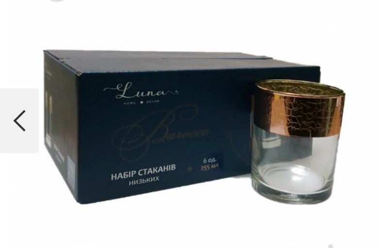 Набір стаканів ТМ Luna, серія Barocco, 6шт, 255 мл. Висота 8.5см. Діаметр 7см.