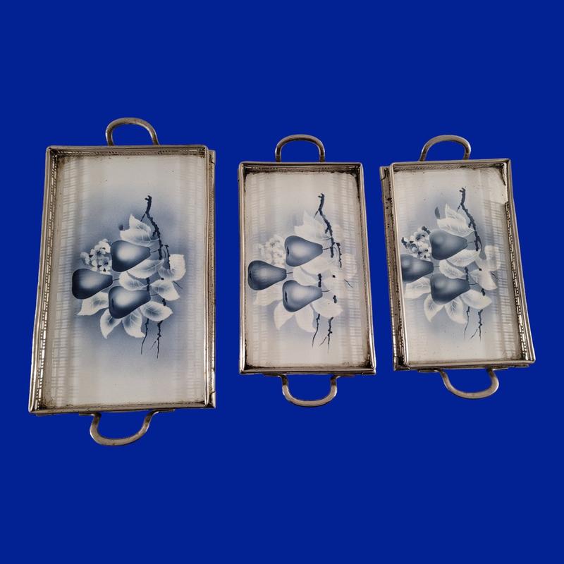 Винтажные подносы с керамикой "Фрукты" арт. 0186 Материал: металл и керамика Вес: 0.990 кг, 0.685 кг, 0.655 кг Размеры: ширина: 39 см, 33см, 33см высота: 4 см толщина: 20 см, 16 см, 16 см Период: после 1940 года
