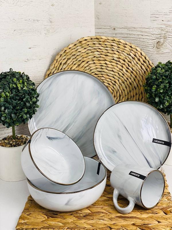 🔥НОВИНКА 🔥 Современная керамическая посуда от Ardesto 🖤 в новом дизайне. Тарелки имеют стильный бортик и мраморный принт которые добавляют оригинальности вашему интерьеру✅ Каменную керамику с глазированным покрытием можно использовать в микроволновой печи✅ Набор: Обеденная 26 см Десертная 20 см Супова 19 см Салатник 16 см Чашка 390 мл