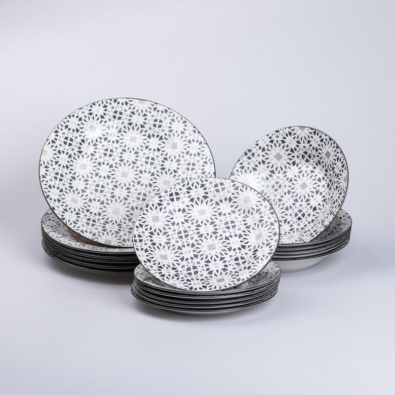Набір тарілок на 6 персон поєднує стильний дизайн і якість. Він стане вашим вірним помічником у сервіруванні столу як для повсякденних трапез, так і для святкових вечорів. У наборі посуду 6 підставних тарілок, 6 десертних тарілок та 6 глибоких тарілок. Основні характеристики сервізу на 6 персон діаметр підставної тарілки 27 см; діаметр глибокої тарілки 20 см; діаметр десертної 20 см. Основні переваги набору посуду Сервіз підходить як для повсякденного використання, так і для святкових застіль. Кераміка – це міцний та зносостійкий матеріал, який прослужить вам довгі роки. Набір стане прикрасою вашого столу. Кераміка не містить шкідливих речовин і є безпечною для здоров'я. Набір можна мити в посудомийній машині. Набір поєднує в собі елегантність та функціональність, що робить його чудовим вибором для щоденного використання або подарунка для справжніх цінителів кулінарії та естетики.