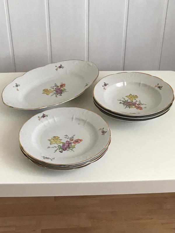 Гарний набір б/у стан хороший, але на кожній тарілці є фабричний брак (фото 6-7) ніби в очі не кидається, але все ж таки є, пишу щоб не було непорозумінь. В наборі 5 тарілок: 1 шт овальна тарілка довжина 36 см, ширина 22 см + 3 шт великих тарілок порційних та 1 шт для перших страв