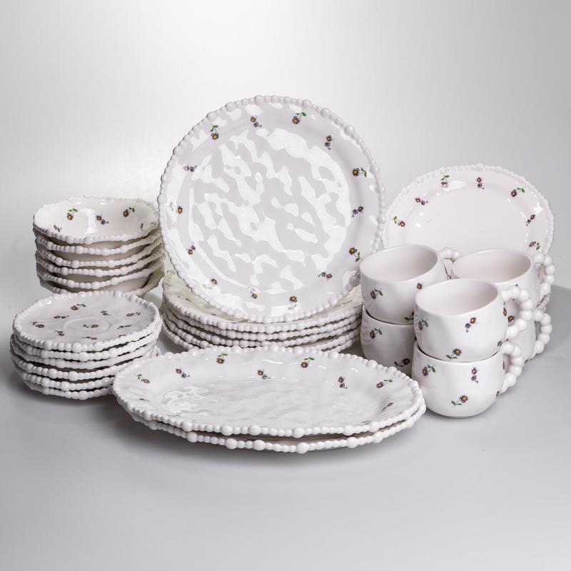 Порцеляновий столовий сервіз Pearl на 6 персон (32 предмети) -- набір посуду з об'ємним декором у вигляді перлин та квітів Особливої уваги заслуговують чашки з унікальною ручкою, виконаною у вигляді кільця з великих намистин -- деталь, яку хочеться розглядати і тримати в руках. Білосніжну порцеляну делікатно прикрашають дрібні фіолетові квіти, розкидані по поверхні, наче на весняній галявині. Такий набір стане ідеальним вибором для тих, хто любить нестандартні форми та тактильно приємні текстури. Завдяки розширеній комплектації з овальними блюдами, ви зможете створити повноцінне сервірування як для сімейного обіду, так і для святкової вечері. Характеристики столового сервізу, набору тарілок та чашок: Тип виробу: обідній столовий сервіз, набір для сервірування столу; Матеріал: якісна порцеляна; Загальна кількість предметів: 32 одиниці; Кількість персон: 6 осіб; Декор та дизайн: рельєфний край у вигляді кульок (перлин), квітковий принт, фігурна ручка; Колір: білий з фіолетовим візерунком; Форма: кругла/овальна з фігурним краєм; Особливості: унікальна ручка чашок з імітацією намиста. Комплектація та розміри предметів (склад набору): Тарілка обідня велика (діаметр 26 см) -- 6 шт; Тарілка десертна/закусочна (діаметр 21 см) -- 6 шт; Глибока тарілка/піала (діаметр 17 см, об'єм 500 мл) -- 6 шт; Чашка чайна (об'єм 300 мл, діаметр 10 см) -- 6 шт; Блюдце (діаметр 14,5 см) -- 6 шт; Блюдо сервірувальне овальне велике (розмір 36 х 20 см) -- 2 шт. Цей сервіз -- втілення ніжності та оригінальності. Назва Pearl (Перлина) тут невипадкова: кожен предмет набору обрамлений об'ємним рельєфним краєм, що нагадує розсип коштовних перлин. Цей дизайн перетворює звичайний посуд на справжню прикрасу столу, додаючи інтер'єру нотки романтики та легкості.