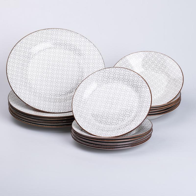 Набор тарелок на 6 персон сочетает в себе стильный дизайн и качество. Он станет вашим верным помощником в сервировке стола как для повседневных трапез, так и для праздничных вечеров. В наборе посуды 6 подставных тарелок, 6 десертных тарелок и 6 глубоких тарелок. Основные характеристики сервиза на 6 персон диаметр подставной тарелки 27 см; диаметр глубокой тарелки 20 см; диаметр десертной тарелки 20 см. Основные преимущества набора посуды Сервиз подходит как для повседневного использования, так и для праздничных застолий. Керамика – это прочный и износостойкий материал, который прослужит вам долгие годы. Набор станет украшением вашего стола. Керамика не содержит вредных веществ и безопасна для здоровья. Набор можно мыть в посудомоечной машине. Набор сочетает в себе элегантность и функциональность, что делает его отличным выбором для ежедневного использования или подарка для настоящих ценителей кулинарии и эстетики.