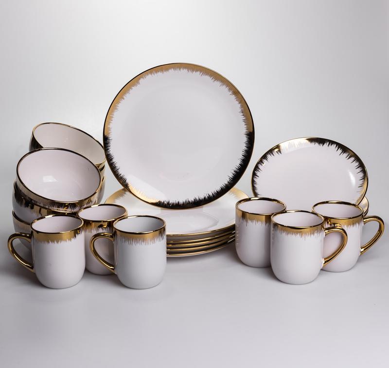 Еталон сучасної класики на вашому столі! Цей білосніжний сервіз поєднує в собі чистоту кольору, фактурність форми та вишуканість деталей. Дизайн та особливості: Посуд виконаний з якісної білої кераміки з рельєфною зовнішньою поверхнею у смужку, що додає йому об'єму та стилю. Головна прикраса -- контрастний обідок золотисто-чорного кольору. Цей делікатний акцент підкреслює форми посуду і надає сервізу урочистого, але водночас стриманого вигляду, який пасуватиме до будь-якого інтер'єру. Ідеальна комплектація (24 предмети): Набір розрахований на 6 персон і включає все необхідне для сучасної сервіровки (актуальні глибокі піали замість застарілих супових тарілок): Обідні тарілки (Ø 27 см): Великі та зручні для подачі основних страв. Десертні тарілки (Ø 19 см): Універсальні тарілки для закусок, салатів або десертів. Глибокі піали/Боули (Ø 14 см, 700 мл): Сучасний тренд сервірування. Ідеальні для перших страв, бульйонів, ранкових каш або салатів. Об'єм 700 мл дозволяє подати повноцінну порцію. Чашки (350 мл): Зручні кухлі для чаю чи кави, що ідеально доповнюють комплект. Основні характеристики столового сервізу з порцеляни: Тип: Столовий сервіз Кількість персон: 6 Кількість предметів: 24 Матеріал: порцеляна Колір: Білий з золотисто-чорним обідком Фактура: Рельєфна (смужка) 6 x Тарілка обідня (Ø 27 см) 6 x Тарілка десертна (Ø 19 см) 6 x Піала глибока (Ø 14 см, об'єм 700 мл) 6 x Чашка (Ø 9 см, об'єм 350 мл) Вага набору: 11.8 кг Цей набір -- універсальне рішення: він достатньо елегантний для святкової вечері та достатньо практичний для щоденного використання.