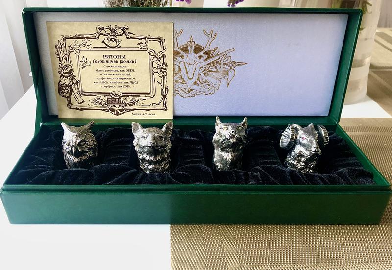 Ексклюзивний Набір ритонів (мисливські чарки) - 4 шт. Масивні за рахунок ваги - вага зазначений до кожної чарки. Овен- 207 г Рись- 205г Лисиця-188г Сова-. 195г Виробник: Майстерня Скляр і сини. Ручна робота, авторські вид: Келихи, чарки матеріал: Бронза (за даними виробника) -черніння , срібло, позолота, цирконій Стан: Нові Реставрація: Немає Дефекти: Немає Вишуканий подарунок для справжнього цінителя розкоші. І просто для колекціонування ! виглядає дуже розкішно ! Набір новий - в користуванні не був.