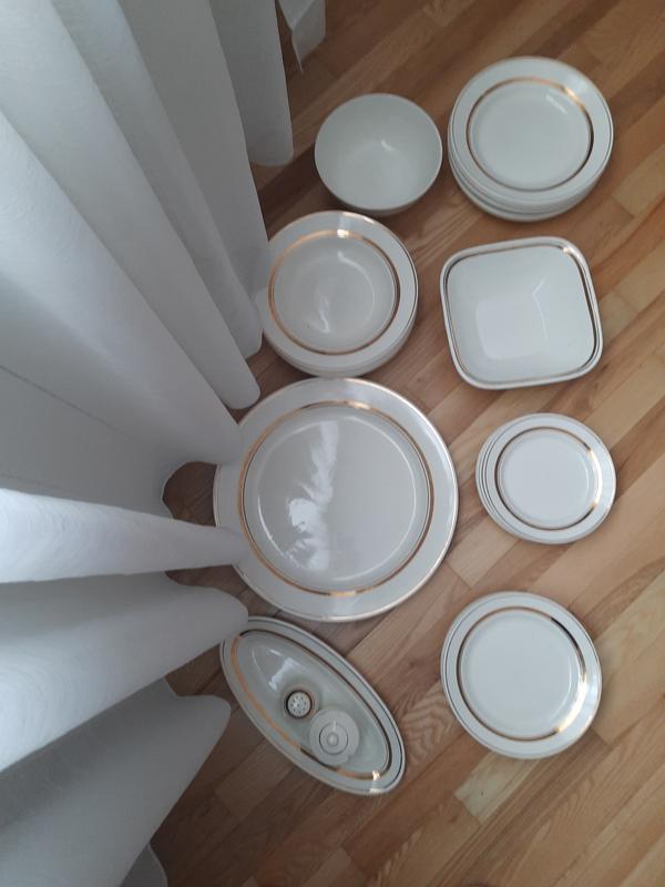 Усі предмети у гарному стані, без столів і тріщин. Тріщина лише на круглій салатниці. Тарілок по 6штук
