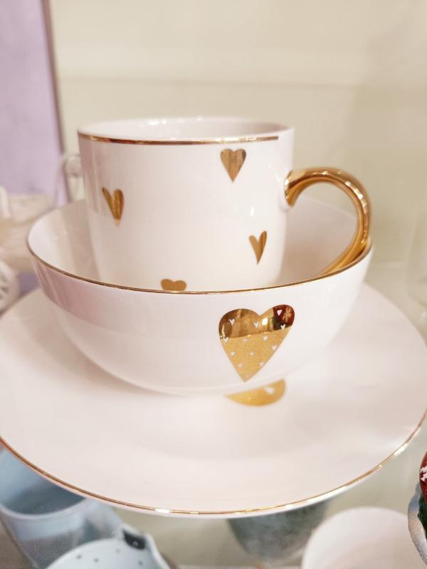 Набор посуды 3-х предметный, тарелка для 1 блюдо,2 блюда, чашка, сердечки, золото, высокое качество, лучший подарок,