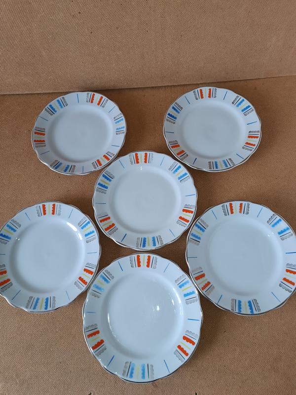 Набір комплект 6 шт 17 см десертні білі тарілки в кольорову смужку позолота фарфор 1962 р...