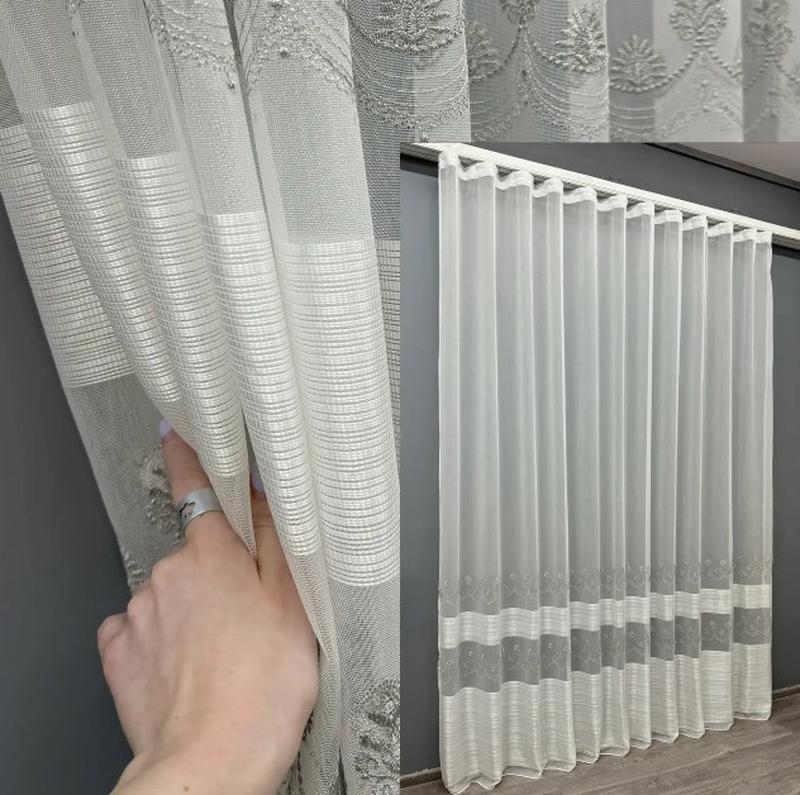 Тюль із бамбука з вишивкою виконаний на натуральній основі під льон. Гардина виглядає стильно та вписується в будь-який інтер'єр. Бамбуковий тюль не затримує повітря, легкий в догляді, не боїться прання та сонячних променів. Особливості тканини: легка, напівпрозора тканина. Виробник: Туреччина. Висота тюлі 3 м, якщо вам потрібний тюль на відріз або з пошиттям вказуєте у коментарі. Колір: Молочний з сірим У нас Ви маєте унікальну можливість замовити послугу пошиття тюлю за приємною ціною. В роботу входить: обробка боків, підрізування потрібної висоти та пошиття на потрібний для Вас спосіб підвісу.