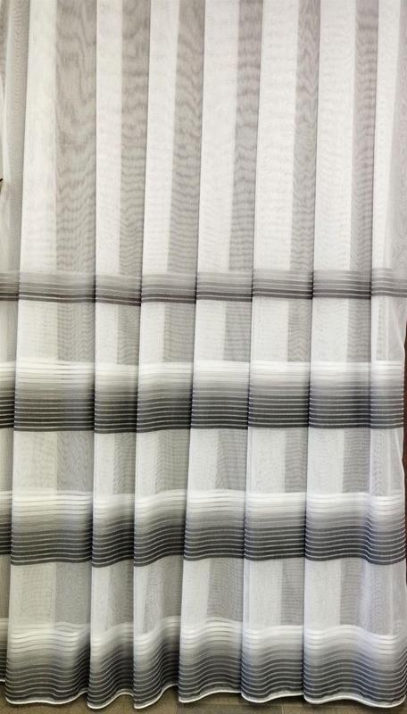 Турецька тюль на батисті у двох варіантах, з візерунком у смужку у три ряди. Смужки мають візерунок від темно-сірого до білого кольору та від темно-коричневого до золотого кольору. Висота тюлю 2,90м, набирається по ширині.