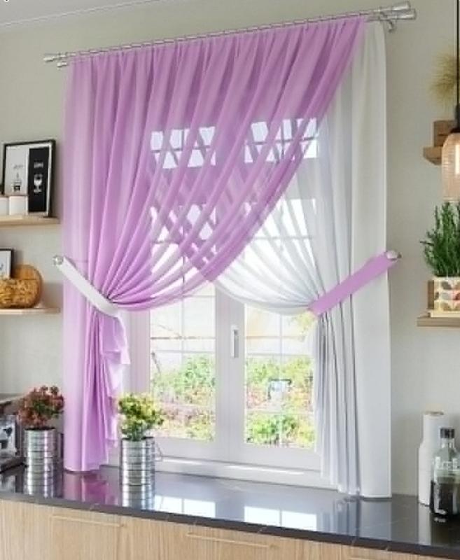 Тюль на кухню з підхоплювачами вуаль бузковий і білий