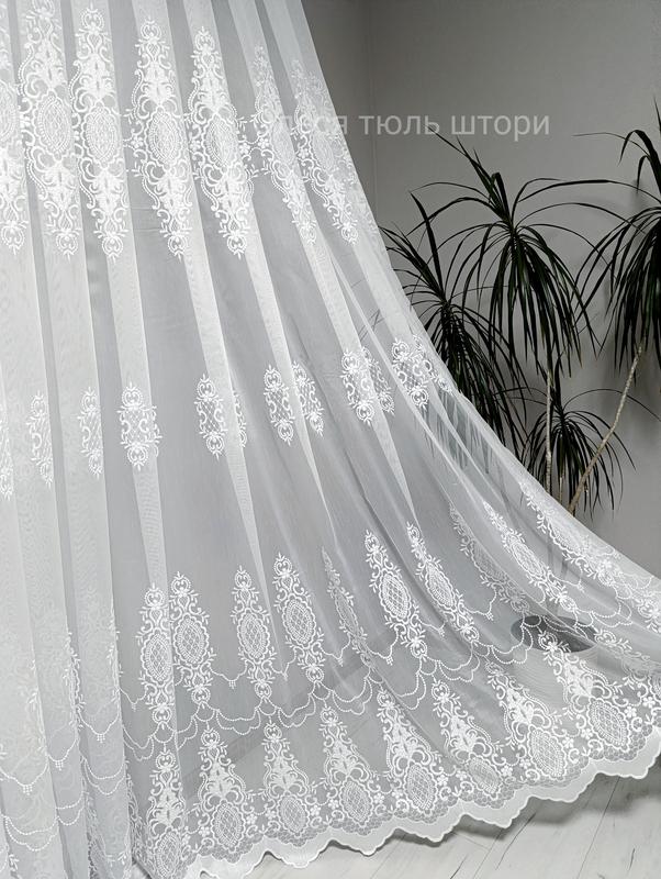 Тюль преміум якості з розкішною махровою вишивкою, основа льон бамбук Колір білосніжний 🔥 Неймовірно гарна вишивка по центру і по низу 👍Дана моделька тюлю підійде для вітальні, спальні, стане справжньою окрасою Вашого помешкання ❗ Висота 3 м набір по ширині ❗ Є послуга пошиття по Вашим розмірам на всі види тесьми і ручну складочку ❗ Виробник Туреччина 👍