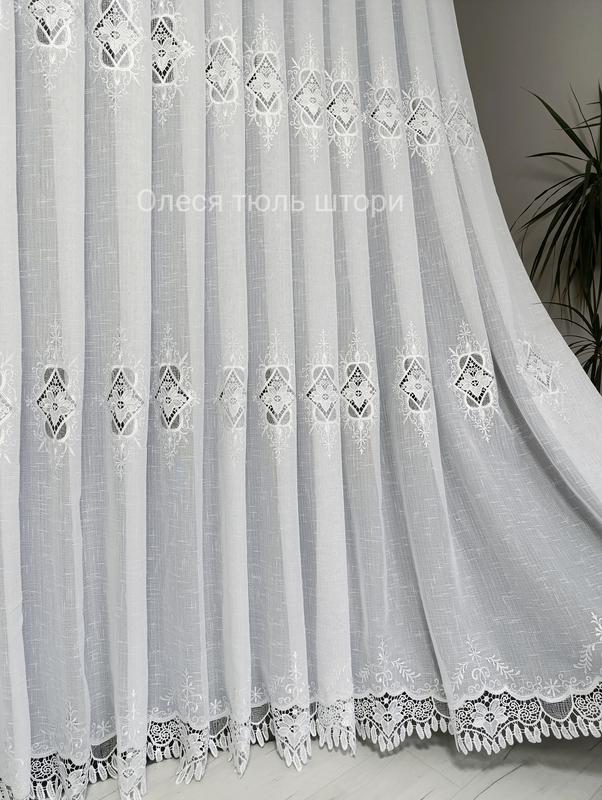 Тюль льон з неймовірною ніжною в вишуканою мереживною вишивкою макраме, колір білий 😍Тюль має щільну основу , ідеально підійде для перших поверхів, на сонячну сторону. Дуже гарна якість , тюль стійкий до впливу сонячних променів, не змінює колір,не вигорає, приємно розміює світло . Висота тюля 275м , набір по ширині. Є послуга пошиття по Вашим розмірам 👍 Ціна вказана за 1 м погонний.