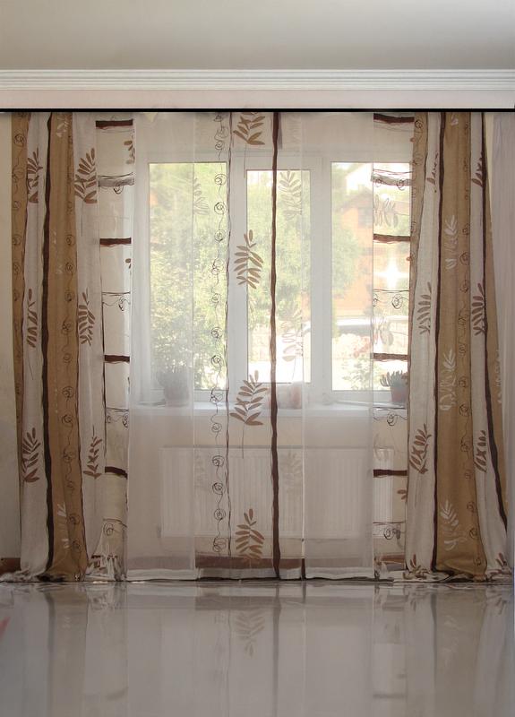 У комплект входять: 2шт штори з боків шириною 1м (можуть бути робочі), 2шт японські панельки молочні шириною 47см, 1шт панелька з малюнком шириною 67см, 2шт вузькі панельки шириною 29см. Карниз 300см (також підходить на карниз 200-300см) Висота 275см (можемо зменшити за Вашими розмірами). На тасьмі І знизу і зверху на панельках спеціальні обважнювачі. Тканини Туреччина.