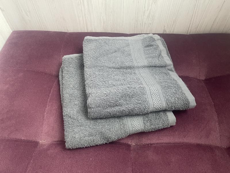 Новий рушник . Розміру 50/90 Гарно поглина вологу, мʼякий, швидко сохнуть,має гачок, по складу 100% бавовна. Є декілька , колір графіт або темно сірий