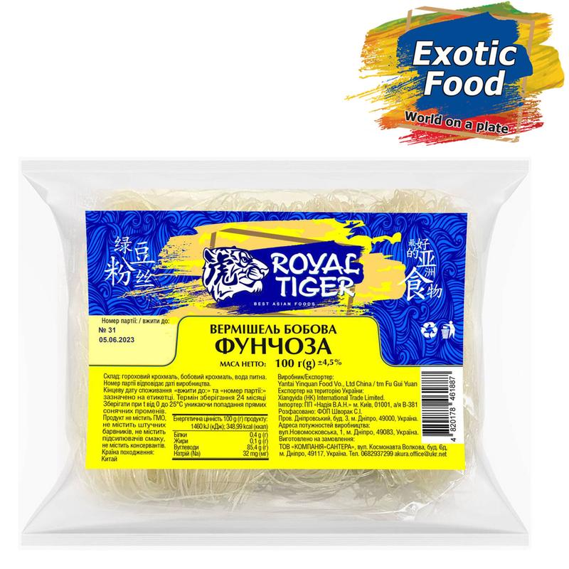 Фунчоза -- приятная, сытная, но, тем не менее, безвкусная лапша. Традиционно блюда с китайской лапшой заправляются соевым соусом. Для фунчозы лучше использовать соус южнокорейского производства, он менее густой. Если есть только густой китайский, то его необходимо разбавить третью воды. Идеально сочетается с копченой курочкой, свежей морковью или огурцами. Готовить вторые блюда или салаты надо стараться так, чтобы не дать лапше окончательно остынуть, слипнуться или подсохнуть. Состав: горох, зеленая фасоль, вода. Энергетическая ценность: 320 ккал / 1340 кДж. Вес: 100 г