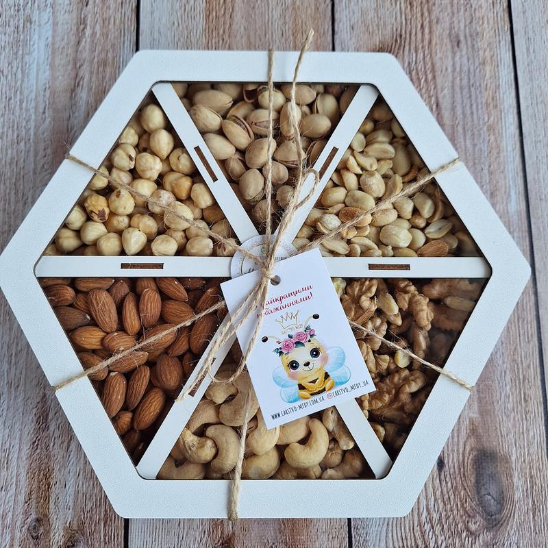 Дерев'яна коробочка поділена на 6 відділів, наповнена горіхами. Така коробочка чудово підійде на подарунок, до різних свят. Наповнення: - Фісташка - Фундук - Волоський горіх - Мигдаль - Арахіс - Кеш'ю Ми збираємо горішки до коробочки під замовлення, тому Ви можете бути впевнені що наповнення будуть завжди свіжі, та смачні. Вага нетто - 700 грамів Розмір коробочки - 25*22*5 см