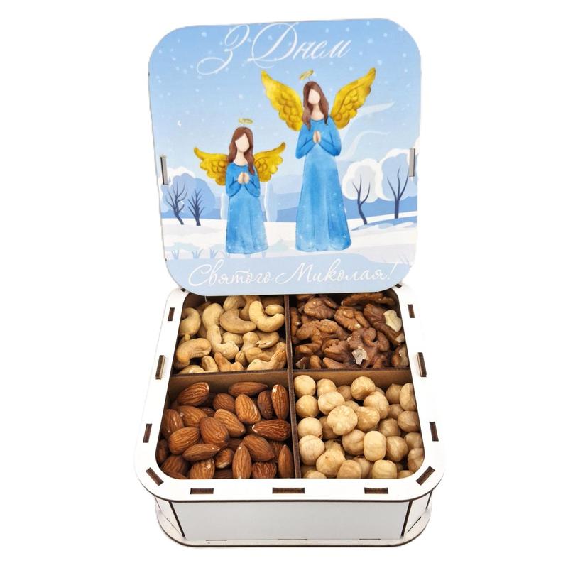 Дерев'яна коробочка з горішками розміром 15*15*5 см. Така коробочка чудово підійде на подарунок до свята Миколая. Наповнення: - Волоський горіх - Фундук - Мигдаль - Кеш'ю Ми збираємо горішки до коробочки під замовлення, тому Ви можете бути впевнені що горіхи будуть завжди свіжі, та смачні. Вага нетто - 400 грамів