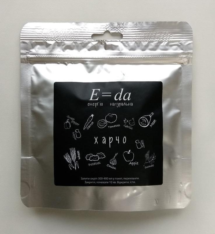 Склад: пластівці пшеничні, картопляні пластівці, м'ясо/ковбаски, цибуля, морква, помідор, яблуко, паприка, уцхо-сунелі, хмелі-сунелі, часник, сумах, сванская сіль, чабер, сіль, перець чорний. Спосіб приготування: залити в пакет 300-400 мл гарячої води, перемішати, закрити zip-замок, почекати 5-10 хв. Приготовлено з сушених продуктів, що зберегли всі смакові якості натуральних. Не використовуються підсилювачі смаку та консерванти. Харчова цінність порції: білки – 11,6 г, жири – 1,2 г, вуглеводи – 37,9 р. Енергетична цінність: 202 кКал. Маса нетто: 65 гр. Вихід готового продукту: ок. 350 мл. Термін придатності: 12 місяців.