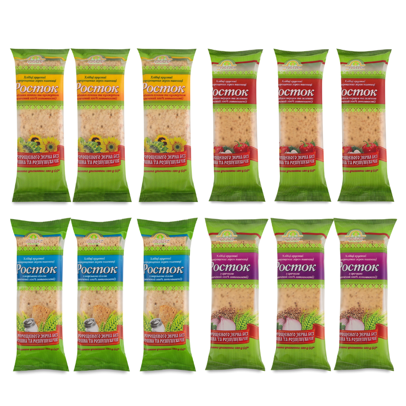 Код/Артикул 48_(009) В набор входят: 1. Хлебцы из пророщенных зерен пшеницы с гречкой, 120 г- 3 шт. 2. Хлебцы из пророщенных зерен пшеницы с морской солью, 120 г- 3 шт. 3. Хлебцы из пророщенных зерен пшеницы с семенами подсолнечника и кунжутом, 120 г- 3 шт 4. Хлебцы из пророщенных зерен пшеницы со сладким перцем и зеленью, 120 г- 3 шт.