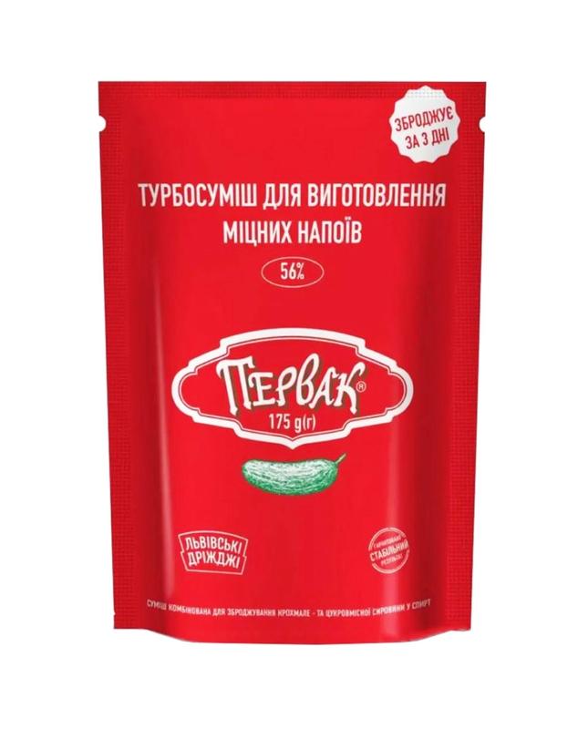 Турбо-Дорожжи Первак на 50 л (174 г) Инструкция по использованию: 1. В емкость объемом 50 л добавляем 40 л воды комнатной температуры. Добавляем 9 кг сахара. 2. Добавляем пакет No2 (Компоненты питательной среды). Активно перемешиваем до полного растворения. 3. Пакет No1 (Специальные спиртовые дрожжи) разводим в 2-3 литрах изготовленного сахарного сиропа. Выдерживаем 15-20 минут. Время от времени перемешивая вливаем их в емкости. 4. Перемешиваем и ставим в теплое место (25-30 °С). Брожение будет длиться 3-3,5 суток. Если используем 9 литров сахара - получим 9 литров крепкого домашнего напитка. Если используем 6 литров сахара - следует использовать 30 литров воды, и получить 6 литров напитка.