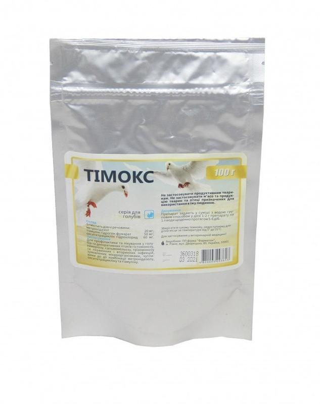 Порошок жовтого кольору зі специфічним запахом. Склад: 1 г містить діючі речовини: метронідазол - 20 мг; тиамулина гідроген фумарат - 50 мг; окситетрациклін гідрохлорид - 60 мг. Допоміжна речовина: глюкоза. Застосування: Для профілактики і лікування у голубів і декоративних птахів гистомоноза, эймериоза, сальмонельозу, трихомонозу і первинних і вторинних інфекцій, спричинених мікроорганізмами, чутливими до дії комбінації метронідазолу, окситетрацикліну і тиамулина. Зберігання: Сухе, темне, недоступне для дітей місце за температури від 5° до 25°С. Термін придатності - 2 роки. Для застосування у ветеринарній медицині!