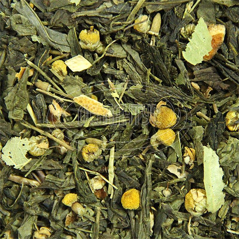 Зелений чай із ромашкою, цедрою апельсина, цвітом липи. Має яскравий