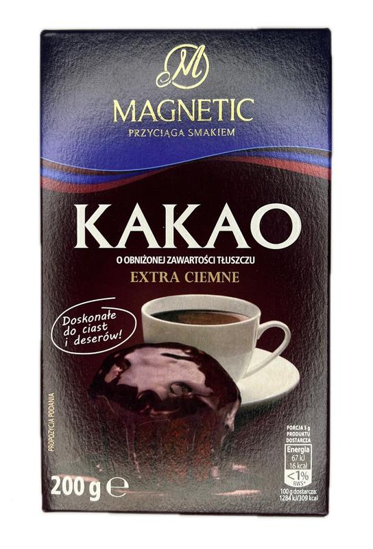 Какао екстра темне Magnetic 200 г - натуральний какао-порошок без цукру зниженої жирності (10-12%). Ідеально підходить для випічки, надає насичений шоколадний смак. Какао Магнетік гарно смакує і в якості класичного гарячого напою з молоком.