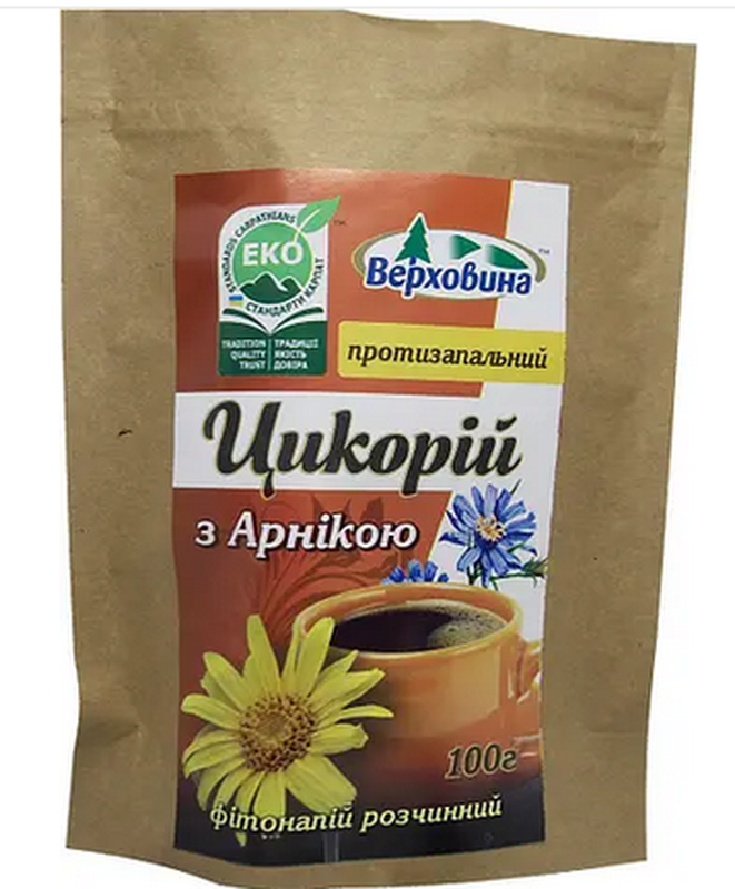 Склад: Екстракти цикорію, ячменю, квітів арніки. Вага: 100 грам Спосіб приготування: одну столову ложку цикорію залити окропом (200 мл .) настояти 4-7 хв Код: 202994