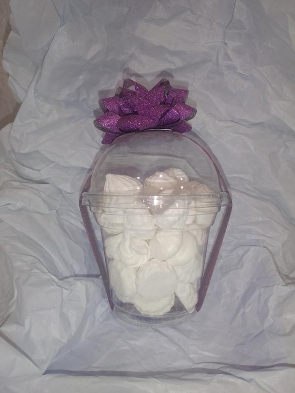 Ніжне домашнє безе, білого кольору, акуратно упаковане в прозору пластикову баночку з кришкою у формі купола. Декороване святковою фіолетовою бантом, що додає приємної естетики та чудово підходить для подарунка. Безе має легку, повітряну текстуру та приємний солодкий смак. Ідеальний вибір для чаювання або святкового столу. Вага і кількість безе уточнюються окремо. У баночці 30 штучок класичних кіссів.