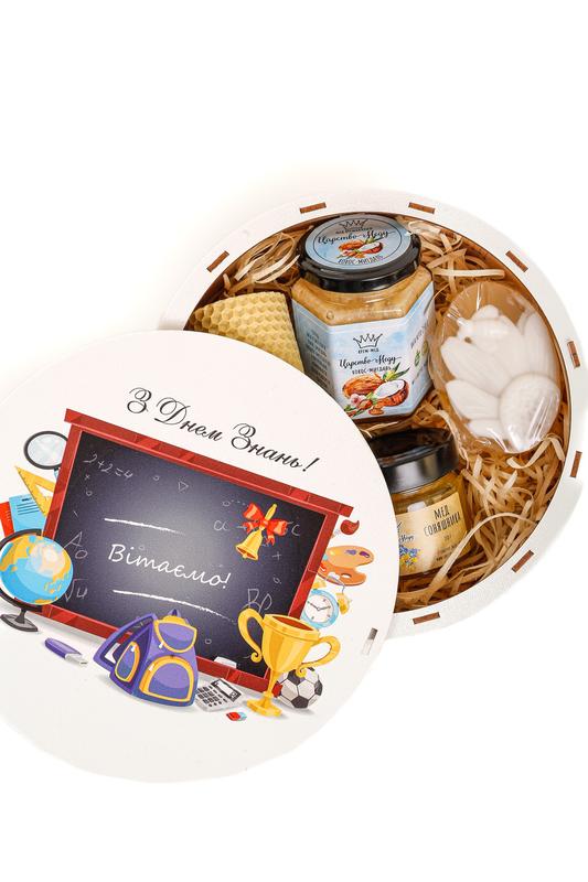 Дерев'яний круглі коробки з написом "З Днем Знань". Такий подарунок чудово підійде на подарунок вчителю. У складі такого набору: - - 13 см воскова свічка - - 250 г крем мед кокос-мигдаль - - 130 г меду соняшника - - Медове мило. Розмір 21*21*8 см