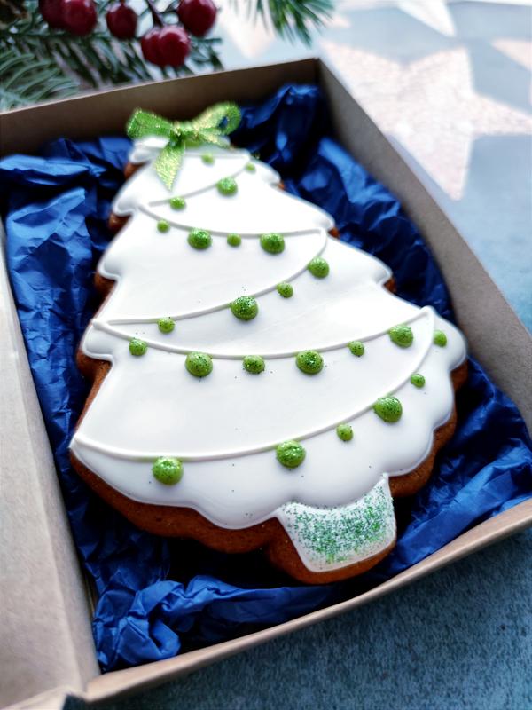 ❄️ Пряник "Ялинка" ❄️ Вас вітає команда CRAFT COOKIES! Ми створюємо медові пряники із запашними спеціями та вручну розмальовуємо їх. Тож, саме тому наш продукт називається крафтовим. ❄️ Пропонуємо вам цей новорічний пряник, прикрашений королівською глазур'ю та харчовим блиском! ❄️ Розмір коробочки 10*15 см ❄️ Медовий пряник всередині крафтової коробочки на декоративній підложці. ❄️ Строк придатності пряника 6 місяців ❄️У складі тільки натуральні та якісні продукти, перевірені роками нашої роботи: Масло вершкове Мука вищого ґатунку Мед натуральний різнотрав'я або акація Цукор Цукрова пудра професійна Яйця Кориця Гвоздика Мускатний горіх Імбир Ваніль Професійні харчові барвники виробництва Україна. ❄️По Україні пересилаємо Новою поштою ❄️Є відправки в Європу ♥️З радістю чекаємо на ваші замовлення!♥️ Товар виготовляється на замовлення