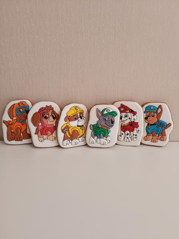 🌸через кнопку Купити не працюю! 🌸Відправка Новою поштою, оплата на карту Під замовлення ❗ Терміни виконання від 7-14 робочих днів в залежності від завантаження. Пряники щенячий патруль під замовлення. Розміри 9.5-10.5 см ціна від 200 грн за одного героя. Лапки ціна від 45 грн за штуку. Пряники з медово імбирного тіста з додаванням спецій (кориця, імбир, мускатний горіх) покриті айсінгом.