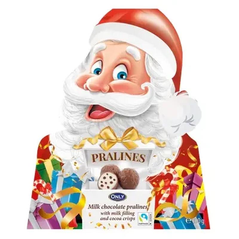 Шоколадний набір Only іграшки на ялинку Санта Клаус, 100 г -- новорічний шоколадний набір цукерок з якісного молочного шоколаду, всередині ніжне молочне праліне з шоколадною крихтою (кранч). Цукерки в гарній новорічній коробці у формі Санта Клауса, який може слугувати як ласощі на свято, а також для прикрашання новорічної ялинки або подарунка. Країна виробництва -- Австрія Кількість у ящику -- 6 шт.