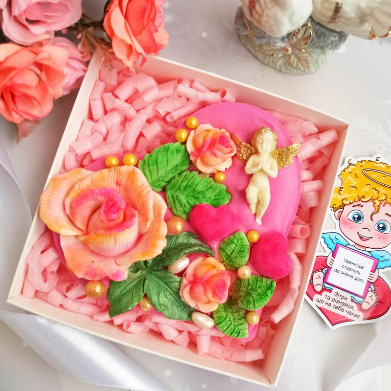 Шоколадний сувенір до Дня Закоханих Вага набору : 130 г Паковання : картонна коробка 12 х 12 см, атласна стрічка, тематична листівка. Виготовлено : білий шоколад ТМ Callebaut виробництво Бельгії з додаванням натурального порошку полуниці Покриття фігурки : харчовий перламутр, харчовий барвник. Зберігання 2 місяці від дати виготовлення за температури не вище ніж 21 градуси. Можна зберігати в холодильнику, попередньо повернувши в фольгу, щоб уникнути появи білого нальоту, і щоб шоколад не використовував сторонні запахи. Термін виготовлення замовлення 2-3 дні після отримання передоплати. Під час замовлення враховуйте терміни доставки. У період великих свят плануйте замовлення заздалегідь за 14-16 днів! Після оформлення замовлення наш сайт зв'яжеться з вами для уточнення деталей замовлення.