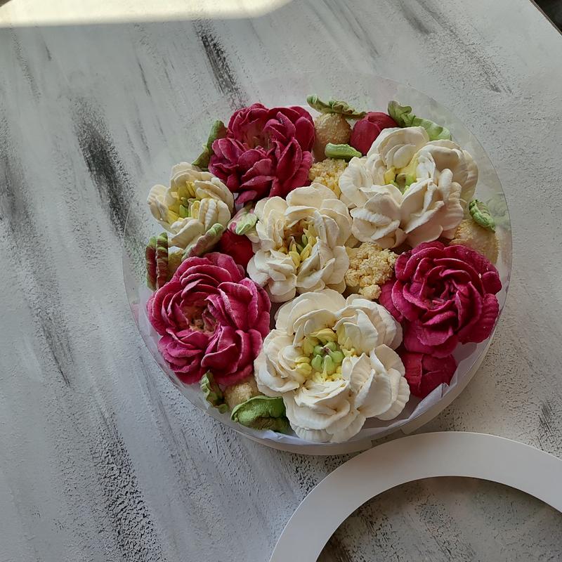 композиція з натурального яблучного зефіру. діаметр аква боксу 25 см, висота 6 см повністю ручна робота. на замовлення можу запропонувати інші варіанти букетів та наборів в коробках є варіанти вибору смаків відправляю по повній передоплаті