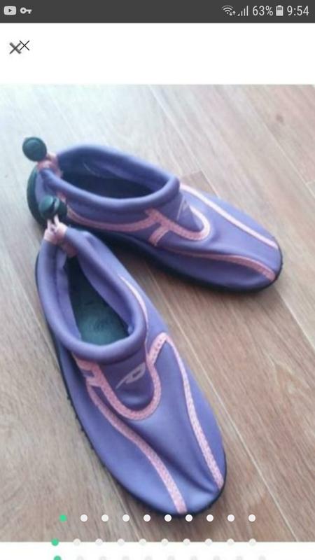 Аквашузы світло-бузкового кольору з обробкою рожевого кольору.з регулятором підйому.на гумовій чорнйї .гнучкій підошві.без устілки.Довжина устілки -20 см. Стан відмінний. Останнє фото - більш реальний колір.точний камера не передає .