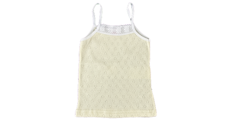 Якісна літня майочка в дирочку на тоненьких бретельках, молочного кольору з білим мережевом.