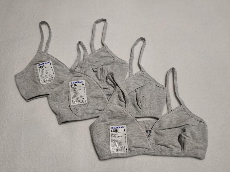 Топ для девочек без застежек от фирмы Baykar в сером цвете. Впереди лиф состоит из двух слоев ткани, поэтому шов вытачки спрятан внутрь и не будет натирать. Фото изнанки прилагаю (последнее фото). Размер 4, на 7-8 лет, рост 134-140: Замеры: полуобъем под грудью 26 см, высота изделия с шлейкой: 22 см(не регулируется). Тянутся. Размер 5 на 9-10 лет, рост 146-152 см: Замеры: полуобъем под грудью 27 см, высота изделия с шлейкой: 23 см(не регулируется). Тянутся Размер 6, на 11-12 лет, рост 158-164: Замеры: полуобъем под грудью 28 см, высота изделия с шлейкой: 25 см(не регулируется). Тянутся Размер 7, на 13-14 лет, рост 170-176: Замеры: полуобъем под грудью 29 см, высота изделия с шлейкой: 26 см(не регулируется). Тянутся Состав: 95% хлопка, 5% эластана. Страна производитель : Турция. Бренд: Baykar. Материал: хлопок. Белье отличного качества. Если нужны дополнительные фото изделия ( фото на теле не делаю) или замеры, всегда отвечу, поэтому делайте покупку обдуманно. При покупке любой продукции белья общим количеством 6 шт и более - скидка 3%. При следующей покупке скидка 3%.