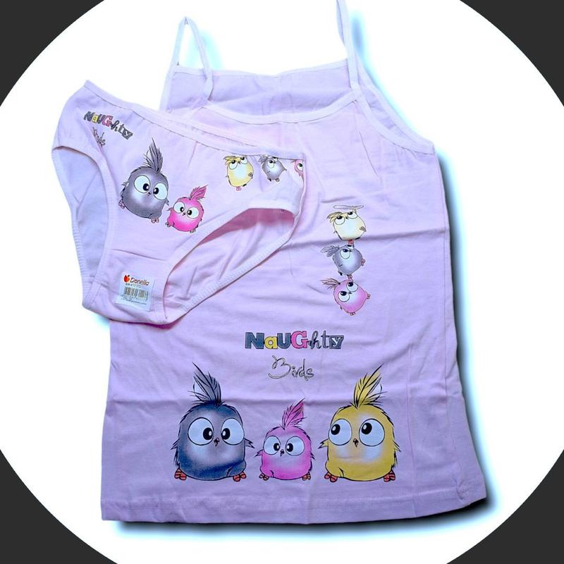 Дитяча білизна відмінної якості. Розмір за віком 8/9 . Виробник DONELLA, Туреччина. Моделі відшиті з якісної органічної бавовни. Анатомічно комфортні. Дитячий комплект майка і трусики для дівчаток з малюнком. Майки на тонких та широких бретелях, трусики прикрашені попереду маленьким бантиком. Склад тканини: 95%бавовна, 5%еластан. Розміри та малюнки треба узгоджувати. Розмірну сітку відправлю в повідомленнях. Мінімальний заказ від 250гривен. Дивіться також інші мої об'єднання яви.