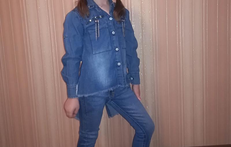 Джинсова сорочка для дівчинки в дуже гарному стані.Тканина м'яка, приємна.Застібка-ґудзики .декорована двома кишенями.Позаду подовжена