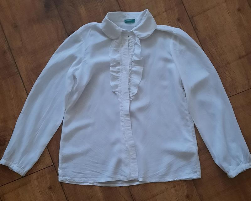 Чудесная белая рубашечка фирмы Benetton. На девочку. На груди планочка с жабо. Руксвчики застегиваются на пуговку. Нежнейший батист легка, невесомая. Состояние: очень хорошее. Размер: 140см (на 8-9 лет) Замеры: - длина от плеча - 52см - длина рукава - 48см - ширина плеч - 33см - ширина горловины - 16см - ПОГ - 42см