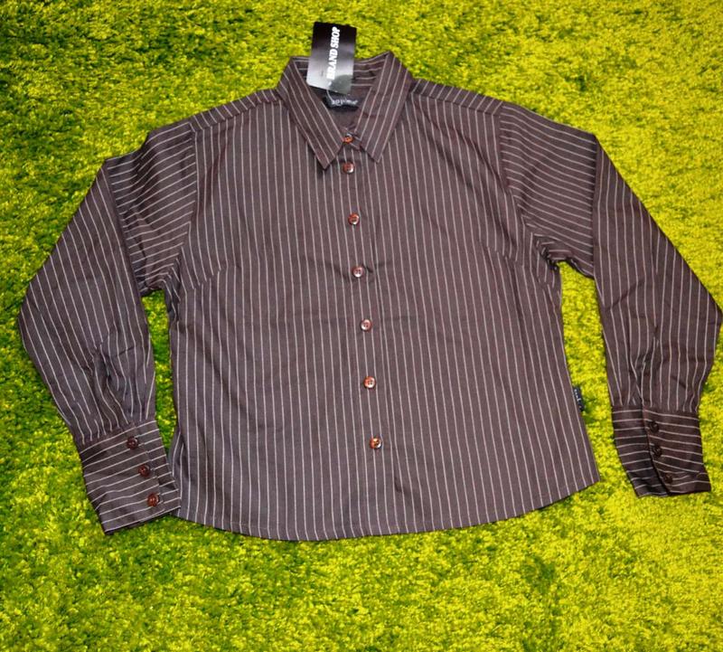 Рубашка на девочку темно коричневого цвета в полоску. На рост 152 см. Замеры: пог 42см, длина рукава 50см, ширина по спинке 34см, длина изделия 48смф