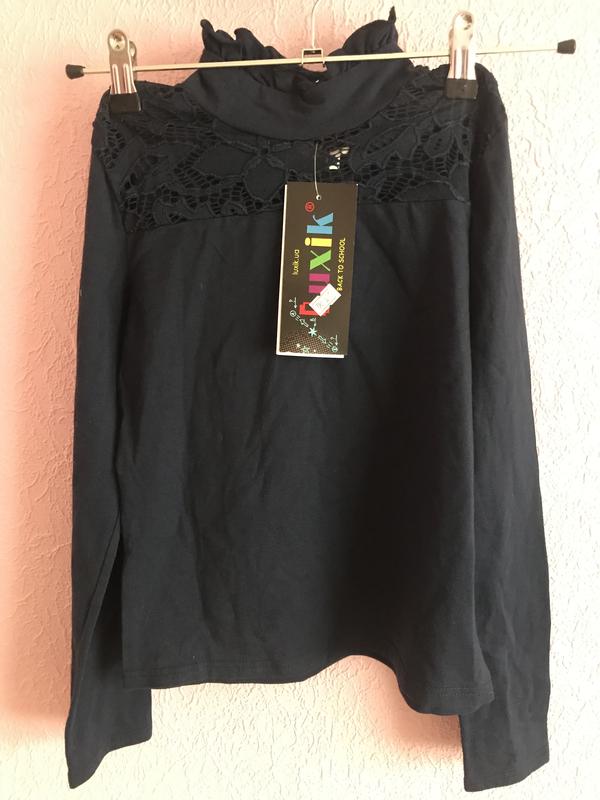 Темно - синя, дуже красива , трикотажна блуза для дівчинки, відмінної якості, виробництва України, торгова марка Люксик, ідеально підходить для осені і школи і під будь-низ. Розмір на ріст 134-140. Дивіться Заміри довжина по спинці 48, ширина під рукавами 37, довжина рукава 54; Виглядає чудово. Ззаду на шиї застібається на кнопки.