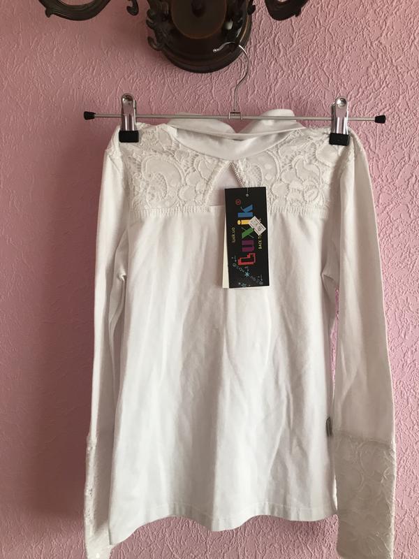 Трикотажная, нарядная блуза для девочки, отличного качества, производства Украины, торговая марка Люксик, идеально подходит для осени и школы и под любой низ. Фабричное качество, новая с биркой, цена снижена. Размер на рост 140/146.Шикарная блуза . Замеры: длина по спинке 51, ширина под рукавами 36-37, длина рукава 52; Хорошо тянется.