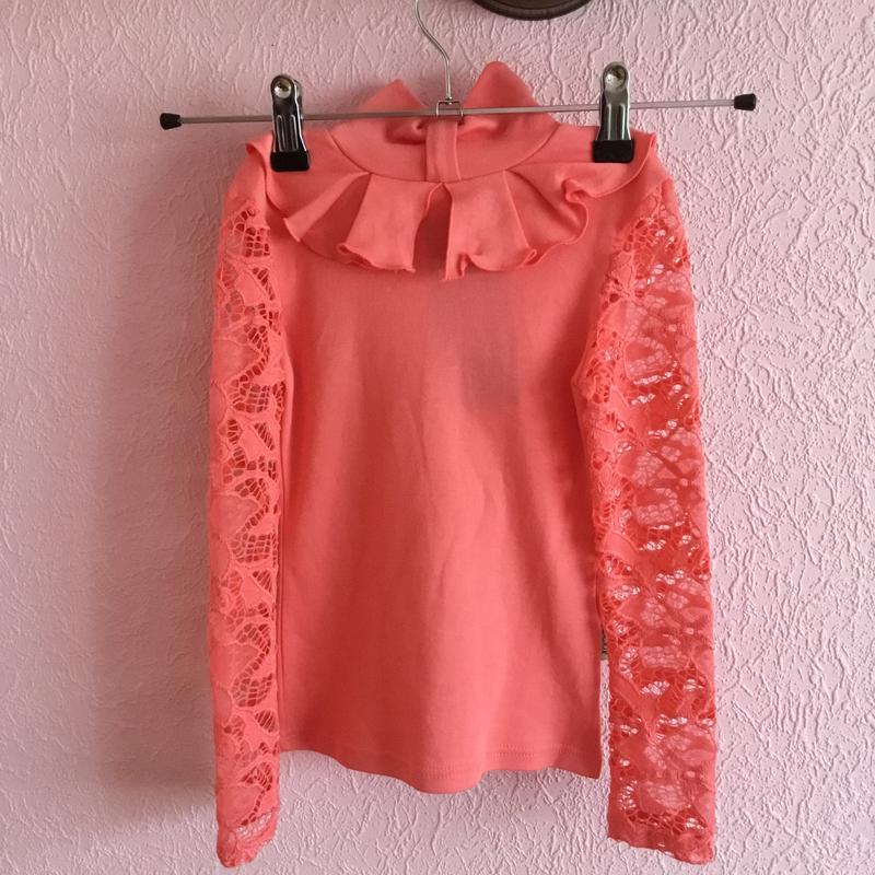 Трикотажна блуза для дівчинки, відмінної якості, виробництва України, торгова марка Люксик. Добре тягнеться, розмір на ріст 116-122. Колір - кораловий. Заміри: довжина 43, ширина під рукавами30, довжина рукава44.