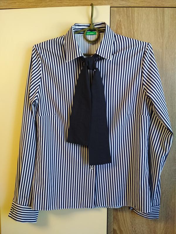 Сорочка в школу і не тільки. Колір: білий на темно-синю смужку. Застібається на гудзик, краватку можна зняти. Заміри: Довжина по спинці – 64 див., Плечі – 38 см, ПОГ – 43 див, Довжина рукава 58 див. Розмір вказаний 158, робіть свої заміри, орієнтуйтеся за ним! Стан ідеальний, як нова!!! Заходьте і дивіться всі мої лоти!!!!