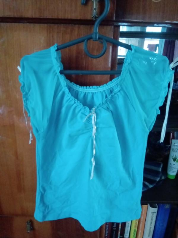 гарна блуза на дівчинку років 5,6,7,8,коттон з стрейч,тягнеться,рукави -сєточка,оригінально дивуватися,колір голубий а рукава бірюзові,при потребі додам заміри