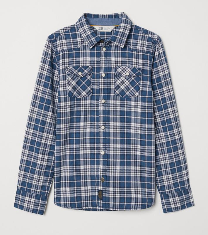 Сорочка з пестротканого бавовняного твілу з відкладним коміром, застібкою на кнопки спереду, кокеткою на спинці і довгими рукавами з накладками на ліктях і манжетами із застібкою на кнопку. Нагрудні кишені з клапаном і злегка округлений низ. СоставХлопок 100%